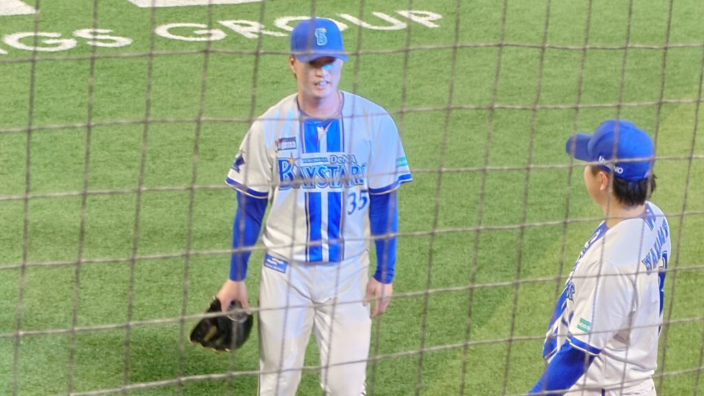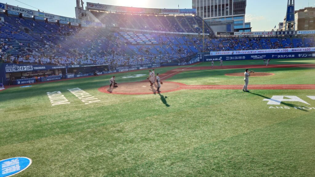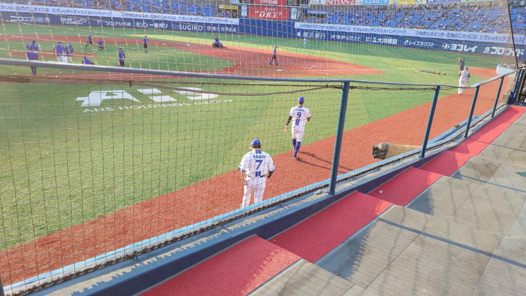 会社の他部門の方が野球好きで、地方出身のため昔からジャイアンツファンということなので、良い席を取るので観に行きましょうということなって取ったのだが、ベイスターズのベンチの上の最前列。ハマスタに着くとちょうど読売がシートノックをグラウンドで行っていた。
