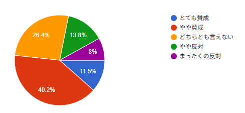 一番多かったのは「やや賛成」で、「とても賛成」と合わせて過半数を超えた。「反対」は19.5%なので好意的には捉えられているのかも知れない。