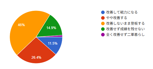 選択肢にしてしまったので、ご自身の考えと若干異なるニュアンスの可能性もあるが、一番多かったのは、「改善しないまま登板する」。Beforeをどこに置くかによっても異なるだろう。MLB時代なのか、移籍前の阪神時代なのか。いずれにせよ、大きく改善できないまま、獲得したからには使わないわけにも行かず、一軍で登板することになるという見方だろうか。