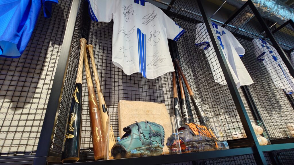 ユニフォーム売り場には、今年のルーキーのサインが入ったユニフォームと野球用品が飾られていた。