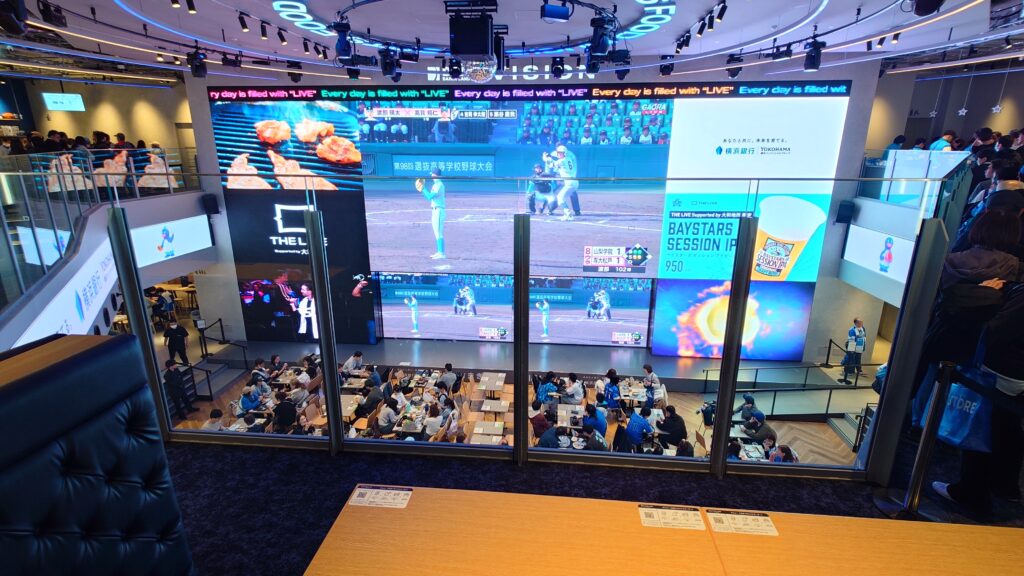 BASEGATE横浜関内に到着後、まずはBAYSTORE Flagship YOKOHAMAへ。15時過ぎで既に店内入場列ができており、10分くらいで入店できた。2階はTHE LIVEが吹き抜けとなっており、巨大なビジョンを囲むようにBAYSTOREがある。レジが左右に分かれていて、並びながらビジョンに映るセンバツの様子を見られる感じだった。