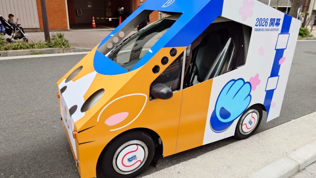 BASEGATE横浜関内の前に止まっていた宣伝カー。小型の自動車にスターマンのデザインのボディを被せているような感じ。