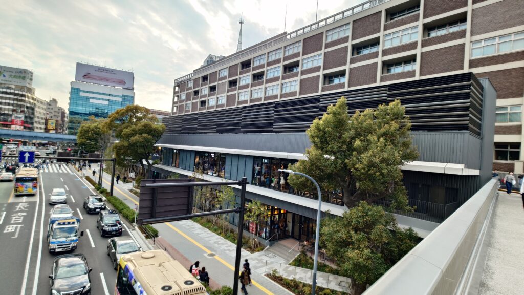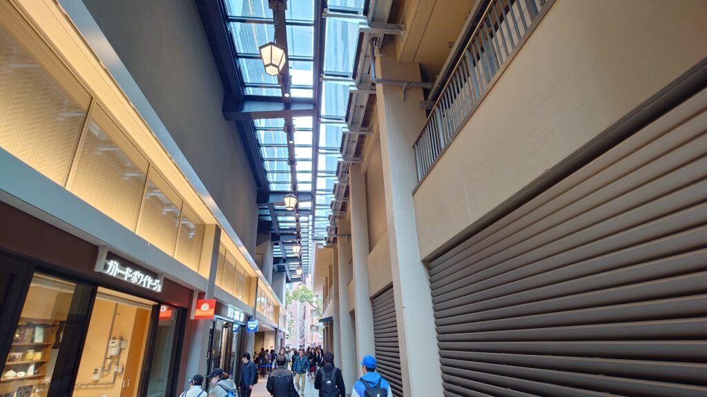 BASEGATE横浜関内のOMO7のあたりから歩道橋まで歩いてみた。BASEGATE横浜関内の2階、BAYSTORE Flagship YOKOHAMAを出てから、2階の通路を歩くとそのまま歩道橋を渡ってハマスタへアクセスできる。