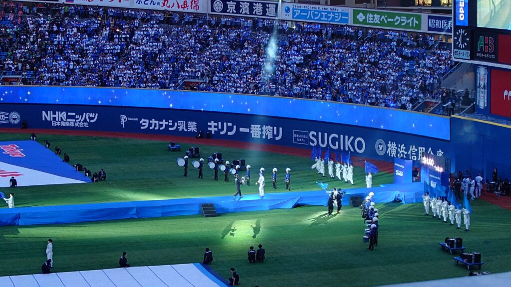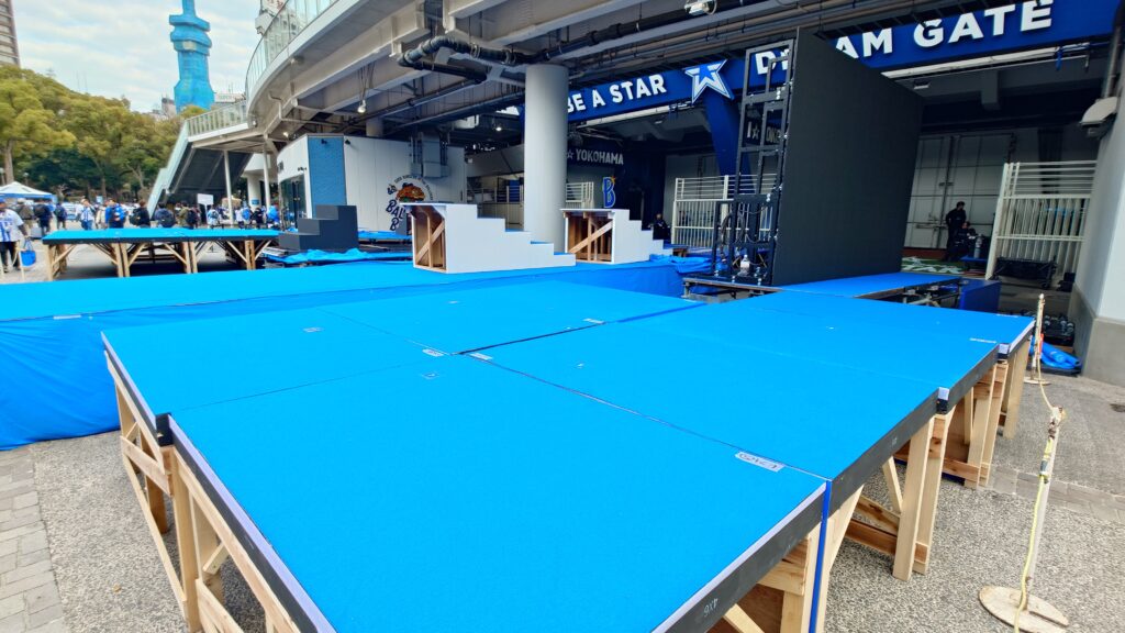 ハマスタに入ってきて、バックスクリーン裏のDREAM GATEには開幕セレモニーで使う台がスタンバイされていた。