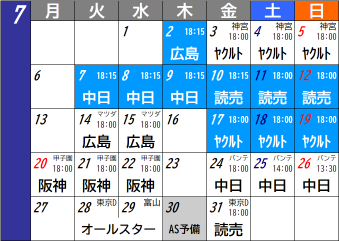 8月はハマスタ6連戦が2度。高校野球の関係もあって、ハマスタでの阪神3連戦が2度ある。8月11日の山の日が火曜のため、9連戦は組まれていない。毎年のことだが、6連戦が続く8月は暑さも含めて体力面の勝負になるだろう。