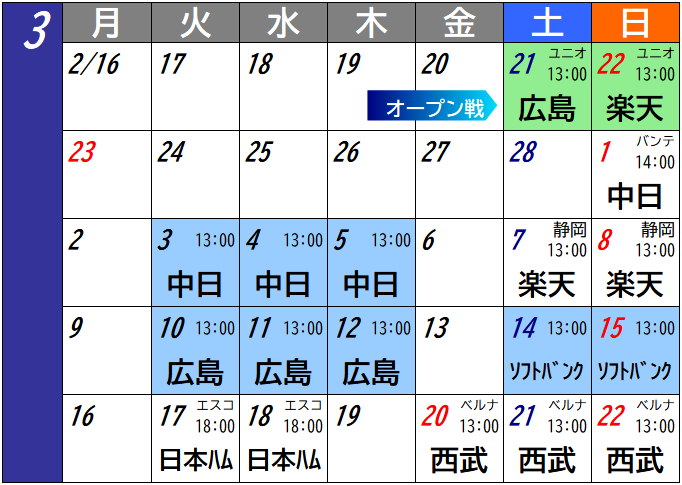 カレンダーを作っていて感じたが、日程の構成がここ数年変わっていない。同じ時期に同じカードが行われるケースが多かった。開幕カードこそヤクルト戦に変わったが、2カード目は3年連続で京セラドームの阪神戦。阪神もホーム開幕が毎年DeNAというのもどうなのだろうか?なお、阪神戦のビジターが京セラドームから始まるのは4年連続。