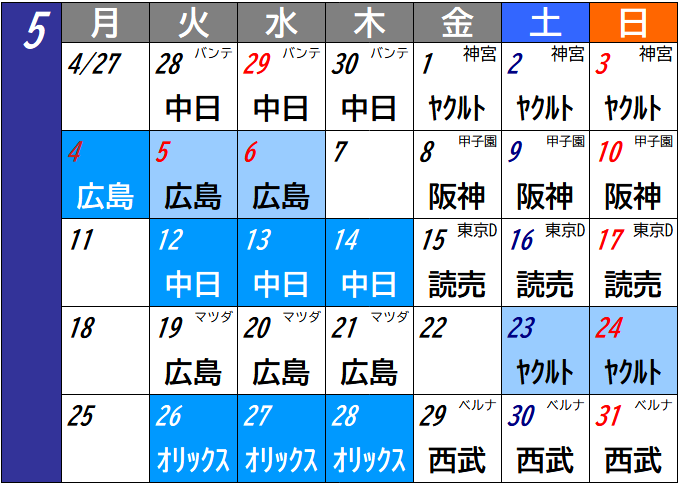 京セラドームの後は東京ドームの読売戦というのは2024年と全く同じ。春先でナイターはまだ肌寒いというところで、ドームで試合を確実に消化できるのは良いとは思うが。4月は真ん中の2週が5試合となる。