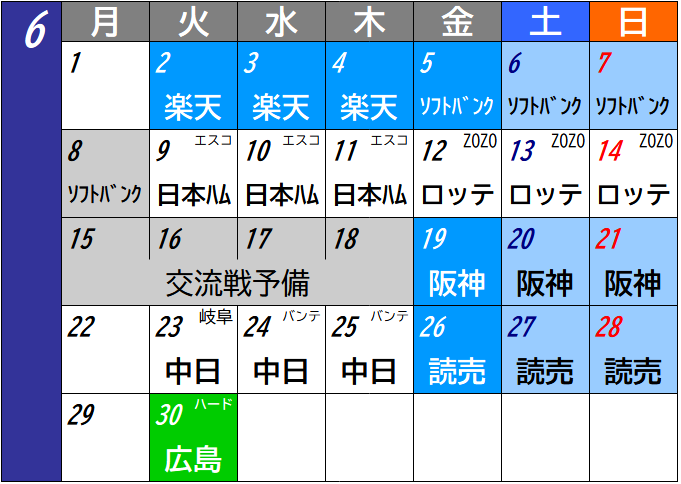 交流戦明けはハマスタでの阪神3連戦でリーグ戦に戻り、翌週には中日主催で岐阜での試合。例年は5月のゴールデンウィーク明けに開催されている新潟でのホームゲームは、6月30日に広島戦。読売、阪神との対戦が多かったが、2009年以降のホームゲームとして初めての広島戦となる。昨年はかなり空席が目立ったが、これは心配。