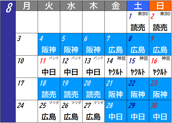 8月はハマスタ6連戦が2度。高校野球の関係もあって、ハマスタでの阪神3連戦が2度ある。8月11日の山の日が火曜のため、9連戦は組まれていない。毎年のことだが、6連戦が続く8月は暑さも含めて体力面の勝負になるだろう。