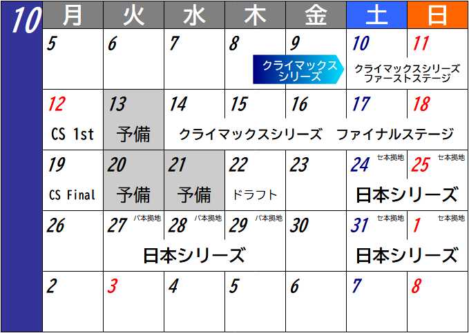 9月24日から、CSファーストステージ開幕の2日前となる10月8日までが、振替試合を組み込める期間となる。CSは例年通り体育の日を含む3連休でファーストステージ、翌週にファイナルステージが行われる。日本シリーズは、2026年はセ・リーグの本拠地から開幕する順番となる。