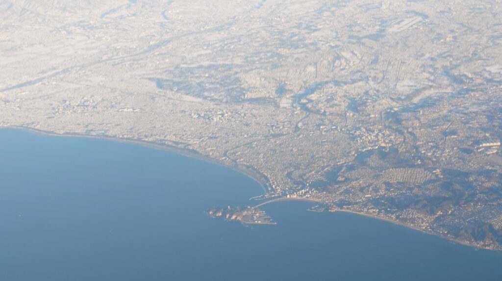 2月9日の早朝便で羽田から那覇へ。前日に横浜も含めて関東で積雪があり、航空便にダイヤ乱れがあった。その余波で、欠航により振替で搭乗する乗客が多く、案内にも手間取って30分遅れで出発。しかし、那覇空港にはほぼ定時で到着する回復を見せた。写真は飛行機から見た江の島付近だが、積雪で全体的に白いのが分かるかと思う。いつもと違った風景を見ることができた。