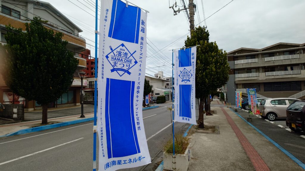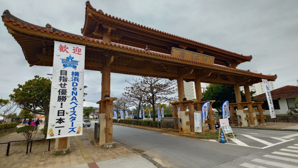 那覇空港からそのまま路線バスに乗り、ユニオンですからスタジアム宜野湾へ。ちょうど良い時間のバスがないため、120系統で第一大山まで行き、徒歩で球場入り。球場近くには歓迎ののぼりが立っていて、いつもの歓海門が出迎えてくれた。
