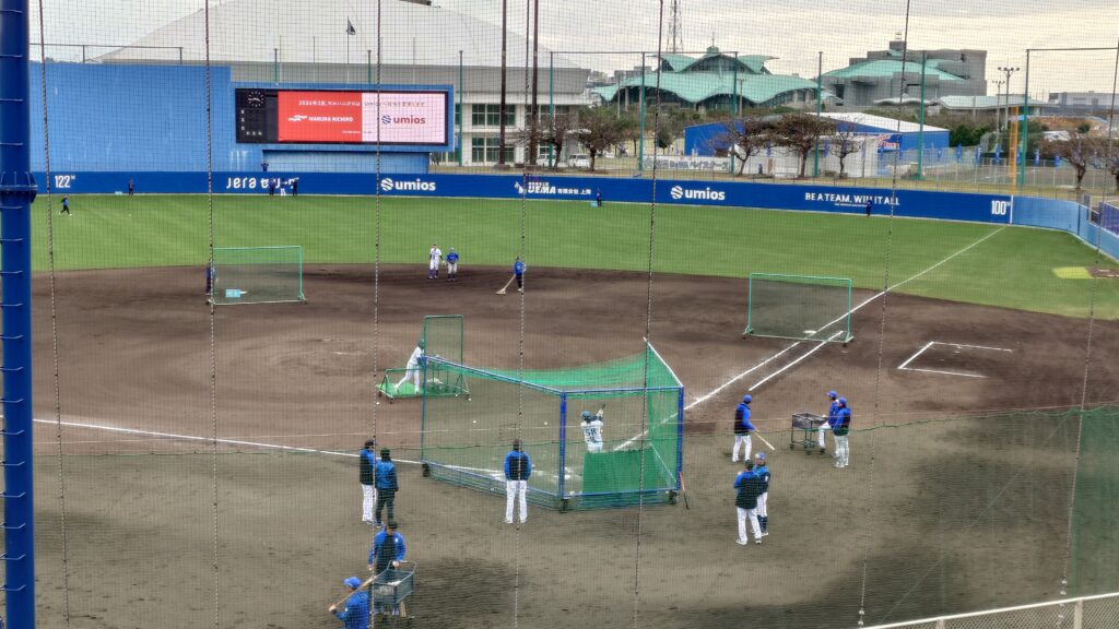 外野の守備練習に名前の入っていた度会と濱は、内野の土のグラウンド部分でゴロのノックを繰り返し捌いていた。度会はサードもオプションとしてあるので、土でのゴロ捌きは重要。