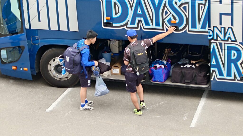 試合後、嘉手納組は球場の裏に停めてあるバスに乗って戻った。このバス、DOCKから遠征に行く時も使っていると思うが、沖縄まで運んで来たのだろうね。選手たちがまだ荷物を積み込んでいる途中だった。