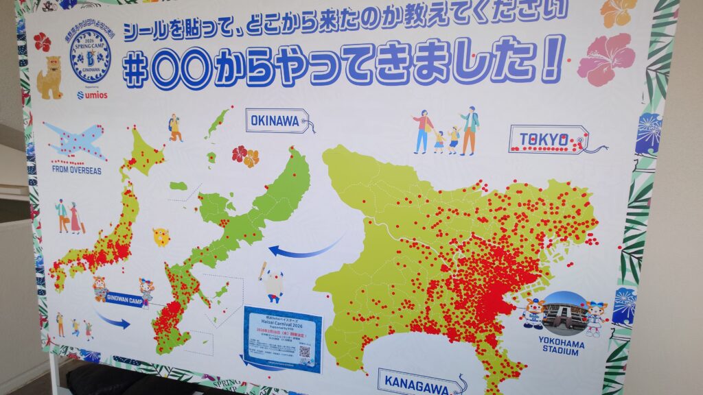 球場の中には写真のようなボードがあって、ファンがどこから来たのか赤い丸シールを貼っている。東京、神奈川が多いのは当然として、沖縄や日本全国、そして海外からもかなり来ているのが分かる(一部はホントじゃないかも知れないが)。